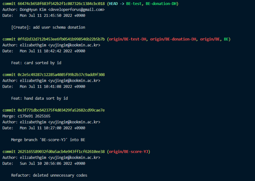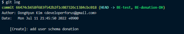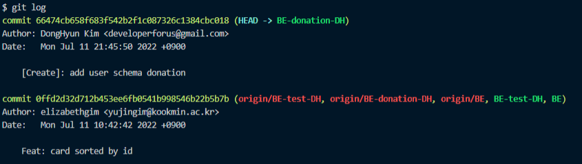 => 아래와 같이 표기된다. HEAD -> BE-test, BE-donation-DH