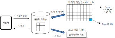 - 분할한 8KB 블록은 페이지라는 논리적 단위로 관리되며 페이지는 SQL 서버가 물리 디스크에서 읽어들인 데이터를