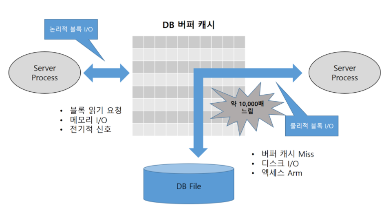 - 디스크에서 읽은 데이터 블록을 메모리 상에 보관해 두는 기능이 모든 데이터베이스 시스템에 필수적인 이유다.
