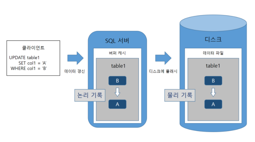 - SQL 서버가 관리하는 데이터가 변경되면 미리 쓰기 로그 조작이 실행된다.