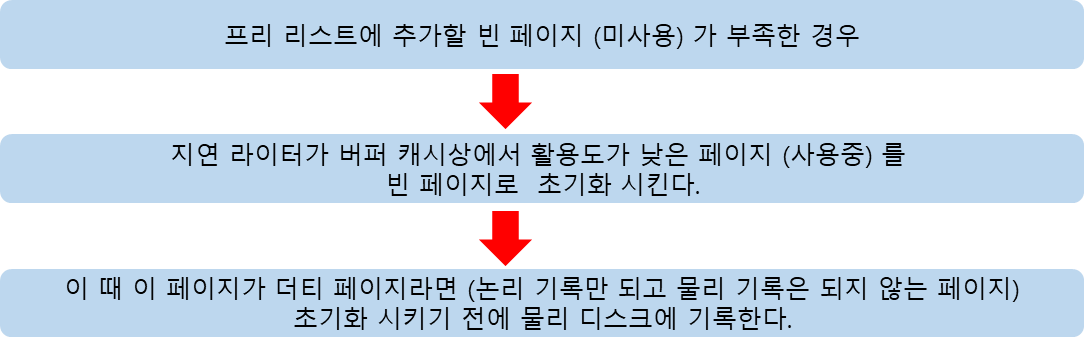 => 만약 이 페이지가 더티 페이지인 경우 초기화를 하기 전에 물리 디스크에 내용이 기록된다. 이 동작을 지연 동작이라고 한다.