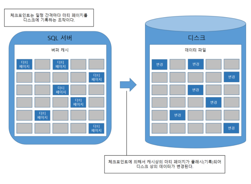 1. SQL 서버 내에는 체크포인트 프로세스라 불리는 내부 컴포넌트가 존재하고 버퍼 캐시에 읽어들인 각 데이터베이스의