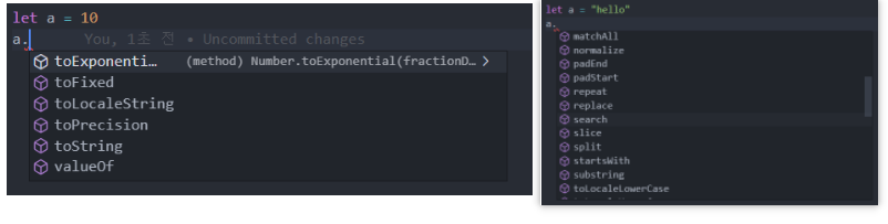 이런 식으로 VSCode에서 각 타입(Number, String ....) 에 맞는 메소드를 자동으로 추천해준다!!
