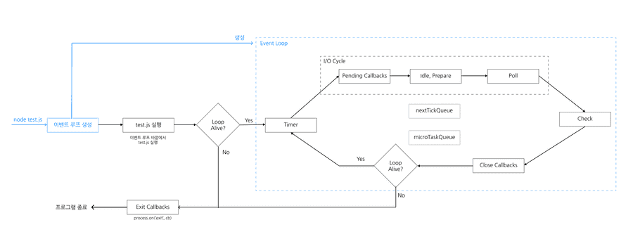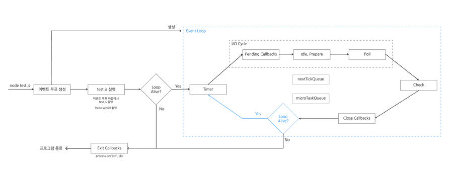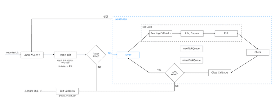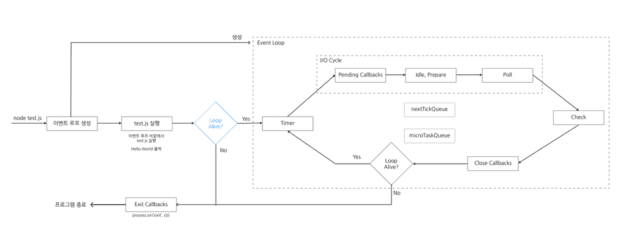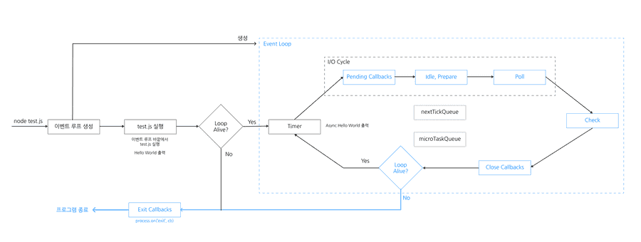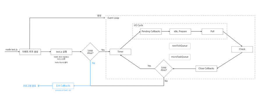 => Loop Alive에 도달하면 이벤트 루프가 살아있는지 확인하고 실행할 작업이 없으므로 process.on('exit')의 콜백을 실행한다.