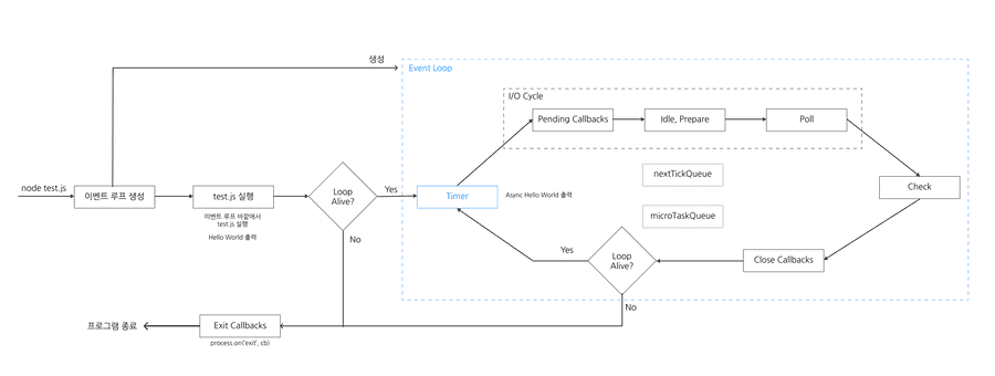 => 이벤트 루프를 만들어 놓고 Timer Phase에 진입하기 전에 test.js를 끝까지 실행한다.