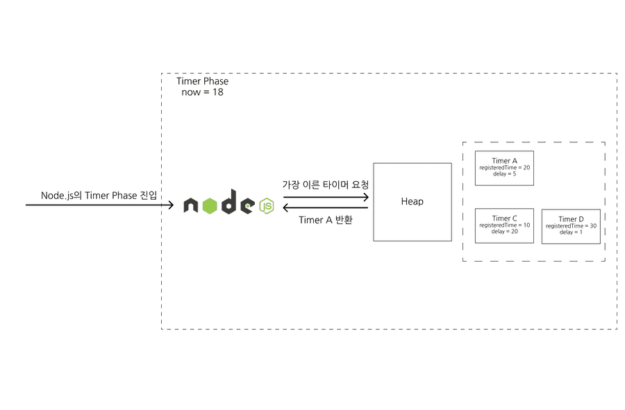 - Node.js가 Timer Phase에 진입하면 min-heap 에서 타이머를 하나 꺼낸다.