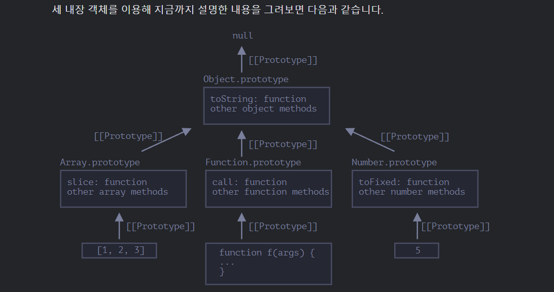 - Array, Date, Function을 비롯한 내장 객체들 역시 프로토타입에 메서드를 저장해 놓습니다.