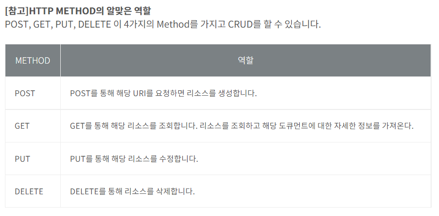 2. 자원에 대한 행위는 HTTP Method( GET, POST, PUT, DELETE )로 표현한다.
