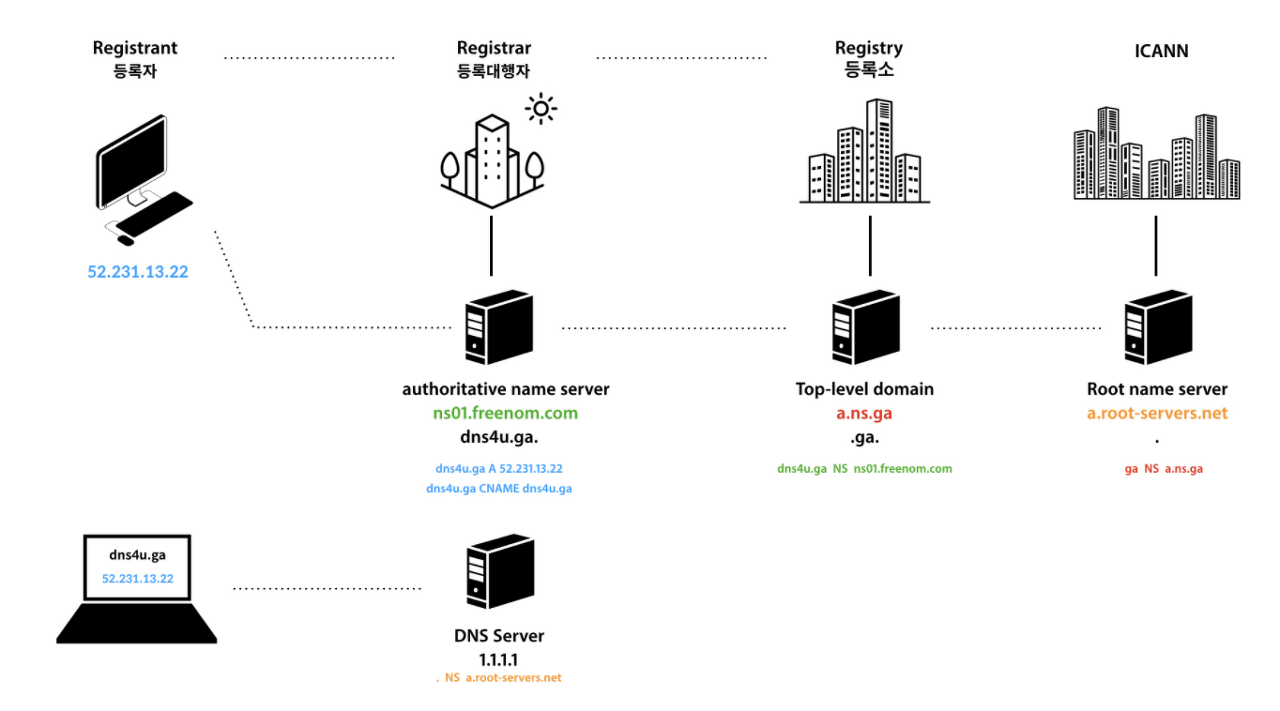 해야 한다. 그리고 Root name Server는 전 세계에 있는 Top-Level Domain의 주소를 기억하고 있고, 우리의 도메인을