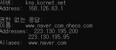 1. " hwan.co.kr " 이라는 도메인 이름의 IP 주소를 알려줘
