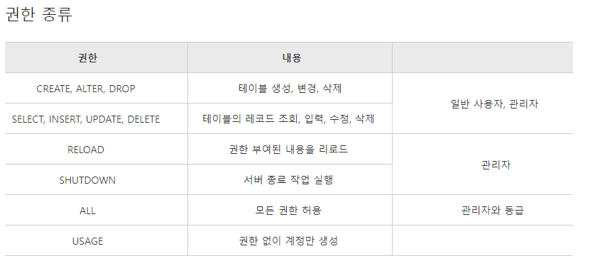 - DB이름.* : 특정 DB의 모든 내용에 접근 가능